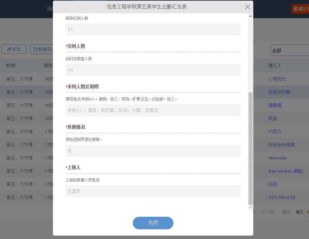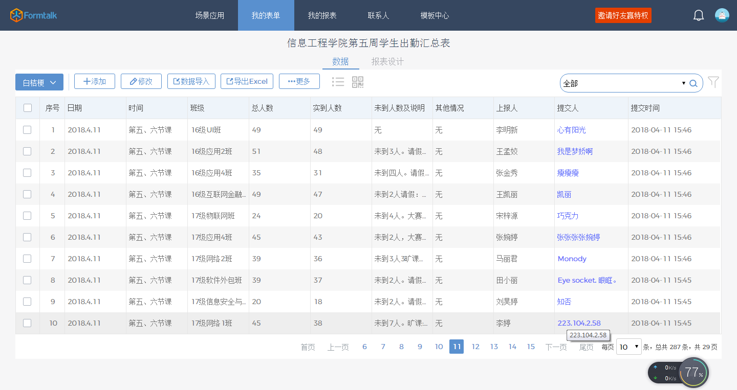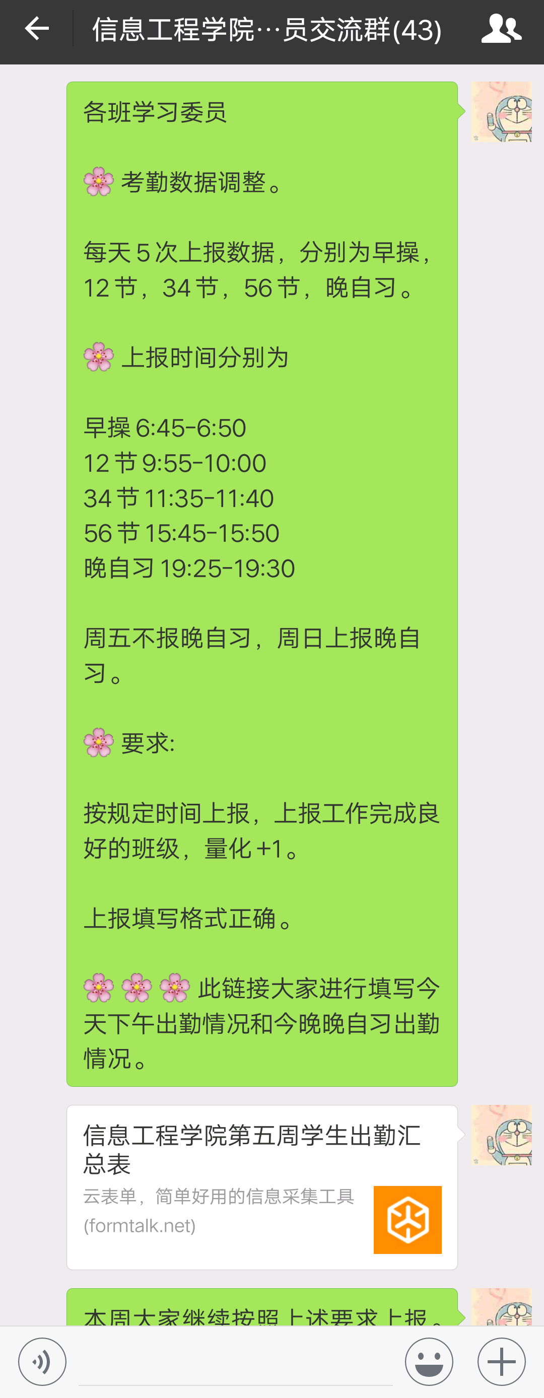 通过formtalk平台试运行,员工考勤工作效果显著。该平台以员工端数据收集,后台数据汇总为主线贯穿始终。在员工端,太阳成集团tyc33455cc建立班级学习委员微信群,由学习委员分别在规定时间段通过folmtalk平台提交班级出勤数据,做到员工考勤每人每天全覆盖。在教师端,通过folmtalk平台进行后台授权,班主任可实时查看班级员工出勤情况,做到班主任与班级信息实时互通,助力于高效开展班级管理工作。