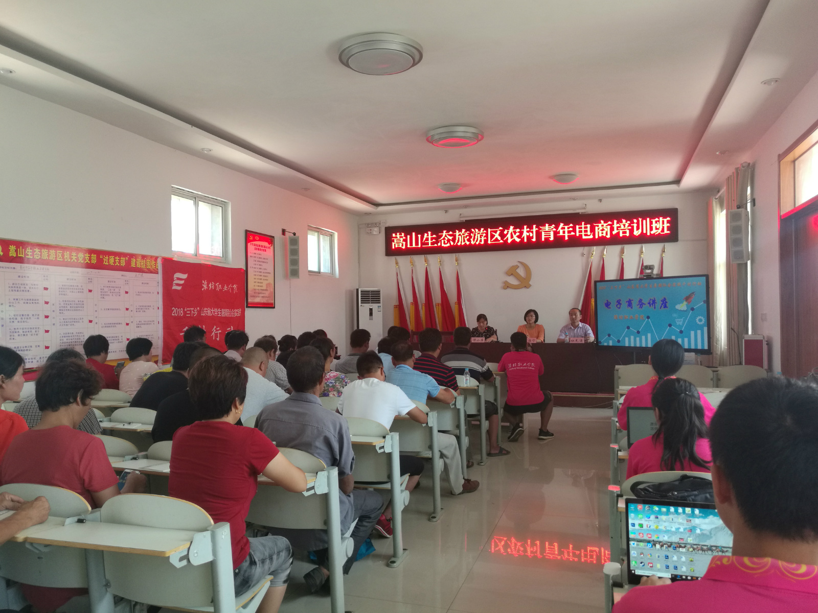 另外,服务团队在学校团委员工处协助下积极联系临朐团县委和嵩山管委会等当地管理部门,争取能够获得最大活动支持。经过努力,电商知识培训班于7月19日上午在嵩山管委会举办,各村的青年代表60余人前来聆听讲座,临朐团县委书记张海宁、临朐县嵩山管委会主任郭守平也参加了本次培训班。